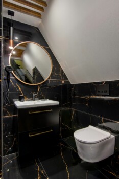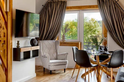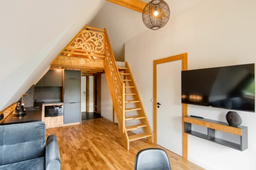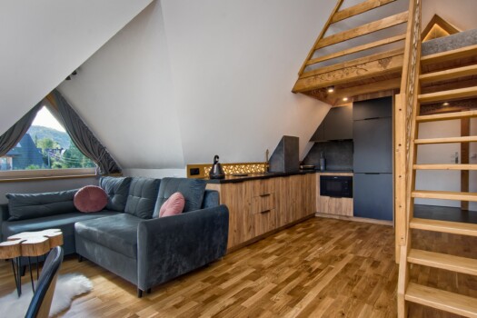 Nowoczesny aneks kuchenny pozwala na pełną niezależność, a łazienka z prysznicem, luksusowymi kosmetykami i miękkimi szlafrokami gwarantuje relaks na najwyższym poziomie.
